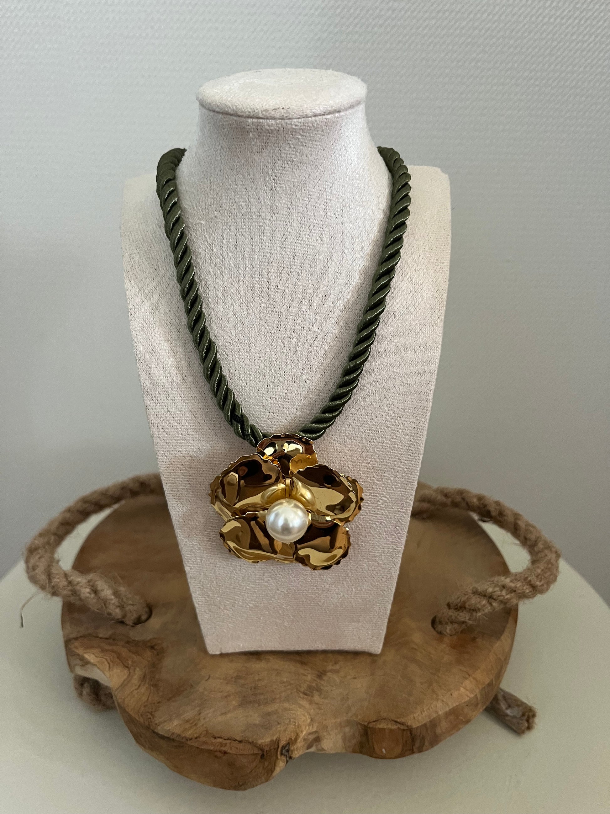 Collier motif fleur doré perle imitation blanche cordon en tissus colorie kaki chaîne de réglage selon la longueur souhaitée.
