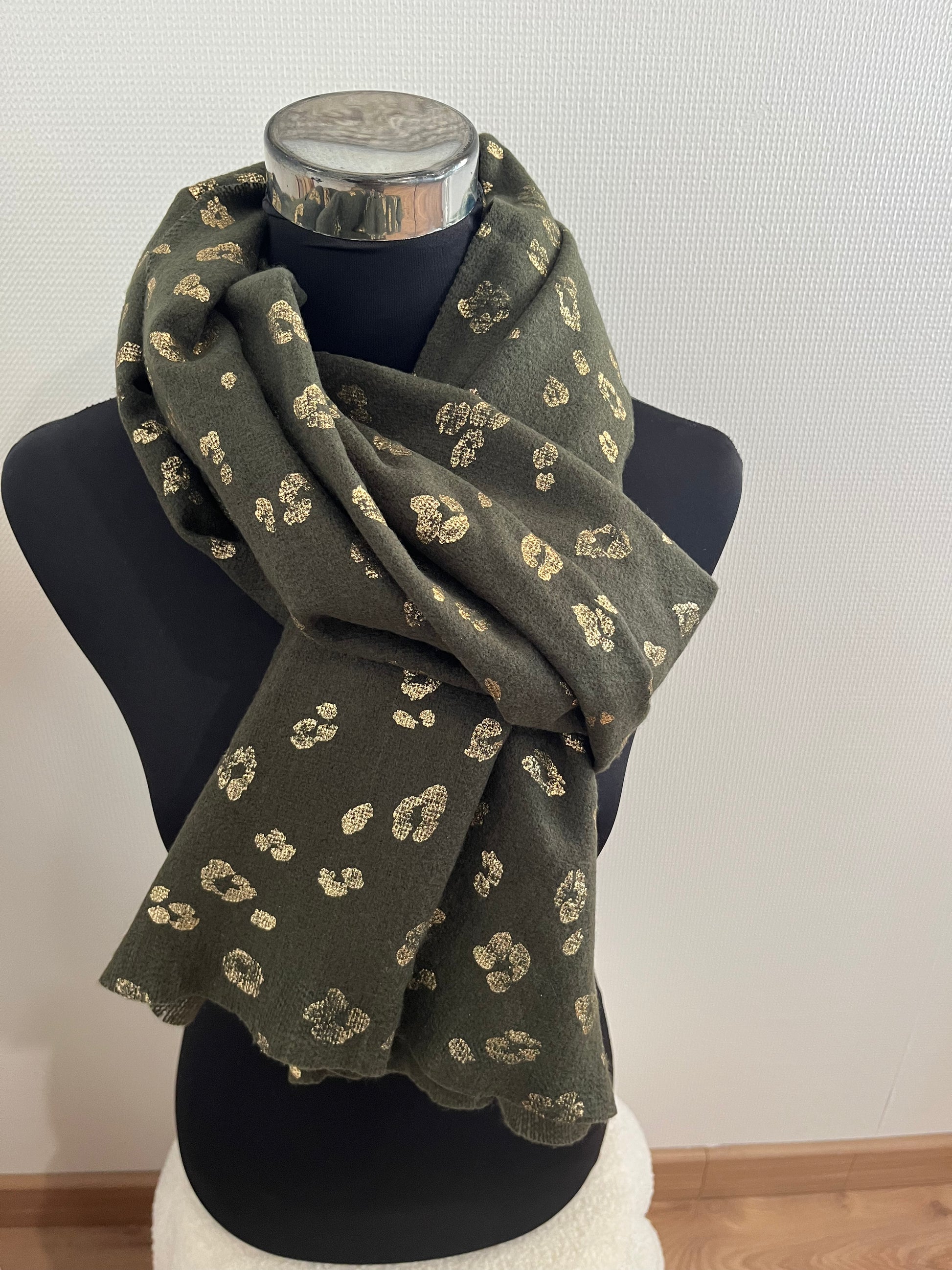 Echarpe douce et chaude colorie kaki avec motifs doré
