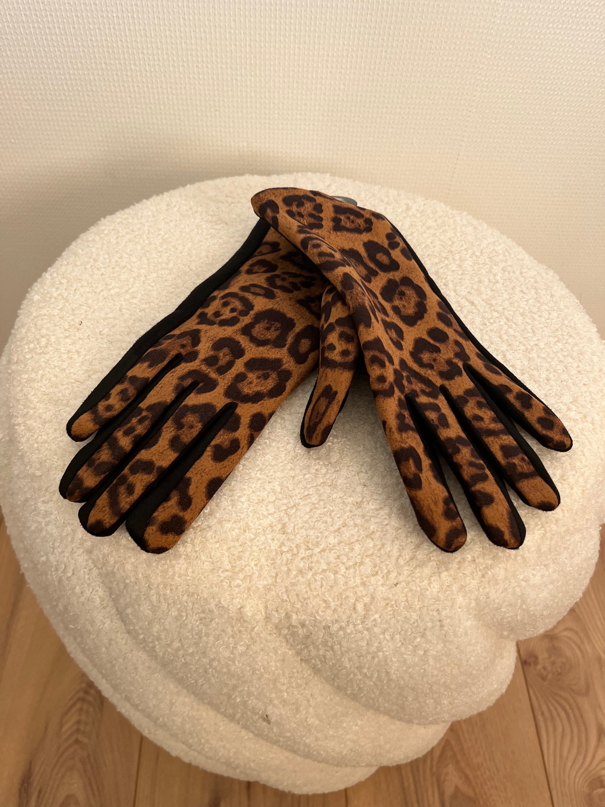 Gant tactile 5 doigts motifs léopard Camel et noir en daim