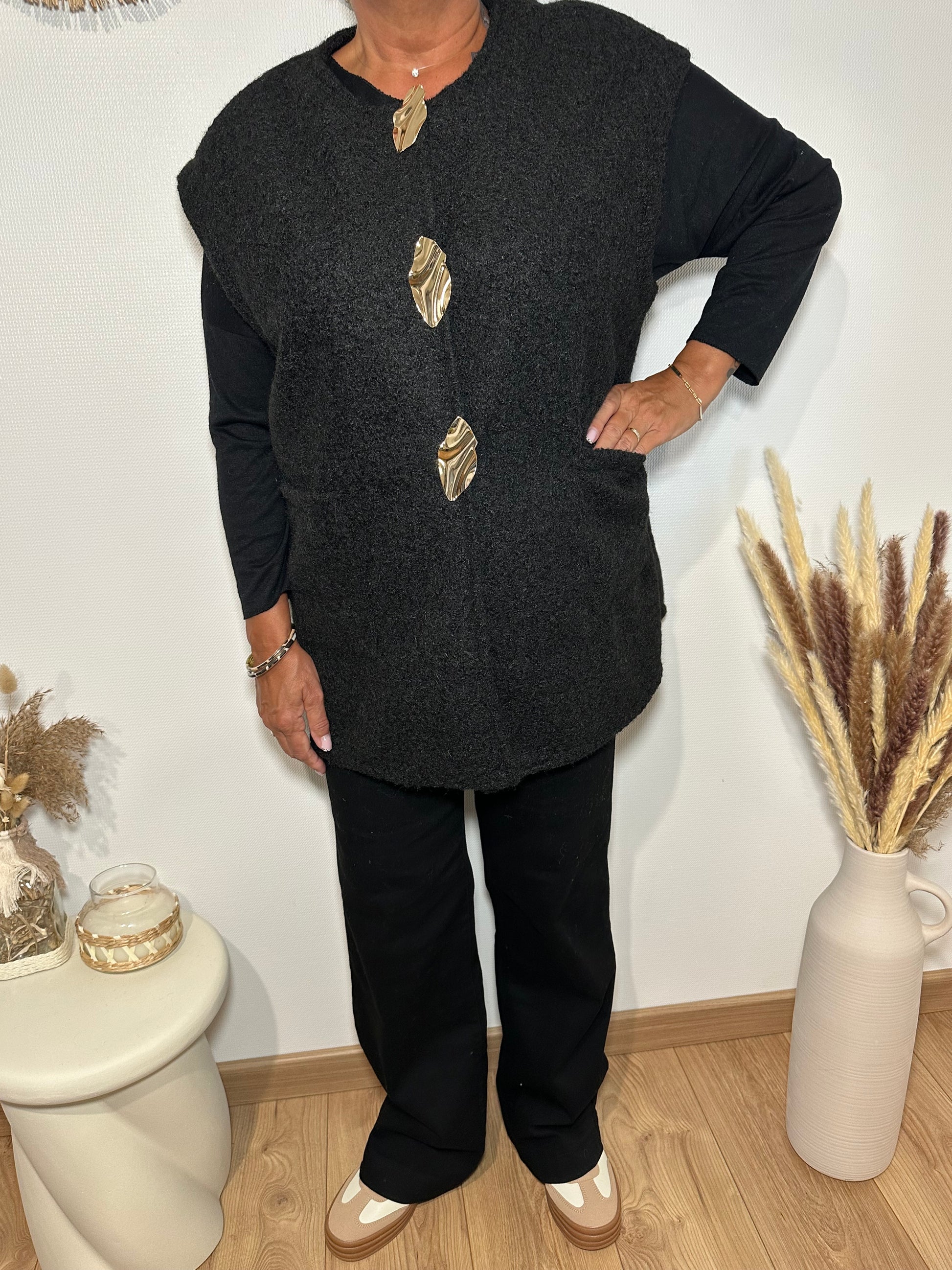 Veste longue feutrine noire 2 poches fermeture par broche doré taille unique convient du 42 au 50